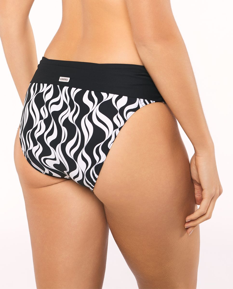 Esta braguita de forma básica es de tiro medio-alto pero sin ser demasiado alta. Mide (unos 3-4 dedos de ancho aprox) cubre bastante bien el culete. El estampado ondulado en tonos blanco y negro es discreto pero muy actual. Es una braguita con la que te sentirás muy cómoda.