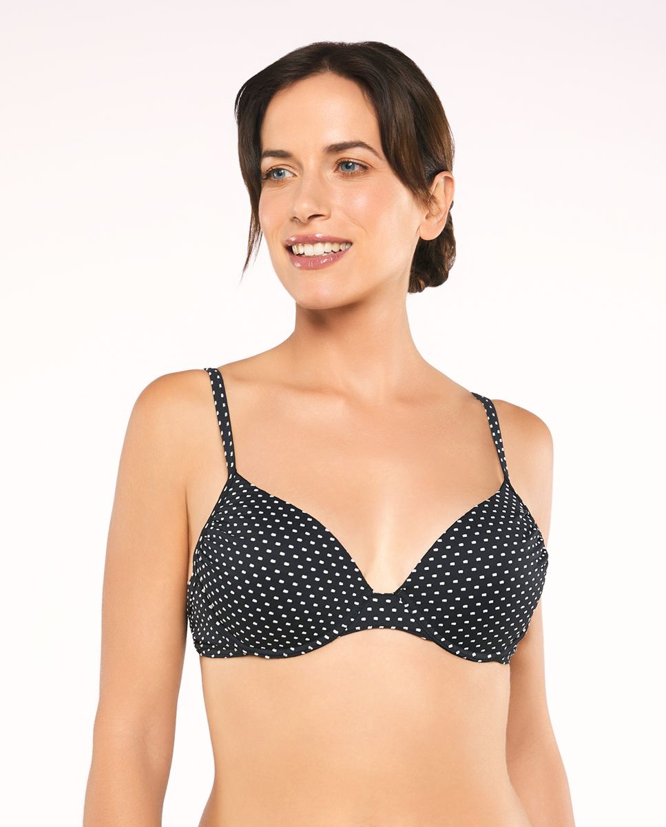 Nos encanta el bikini BRENDA combina un tejido con textura y estampado de topitos blancos en fondo negro muy femenino y atemporal. Es un bikini que no le falta de nada, tiene copas suaves "C" no extraíbles y aros por lo que recoge muy bien, aporta una buena sujeción y hace un escote precioso.